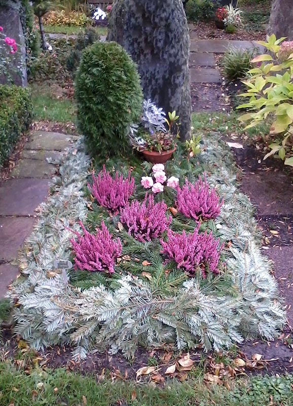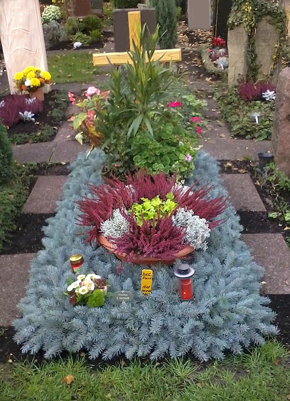 Wir übernehmen für Sie die fachgerechte Betreuung und Pflege des Grabes. Hierfür schließen wir mit Ihnen einen Dauergrabpflege-Vertrag, in dem alle Leistungen, welche wir zuvor miteinander definiert haben, detailliert aufgeführt werden. Der Vertrag läuft mindestens fünf Jahre und maximal bis zum Ende der Ruhezeit. Sie können wählen, welche Leistungen Sie in Anspruch nehmen möchten. Auch bei der Wahl des Grabschmuck und der Zusammenstellung der Pflanzen richten wir uns, soweit dem nicht Vorschriften der Friedhofssatzung entgegenstehen, ganz nach Ihren persönlichen Wünschen.